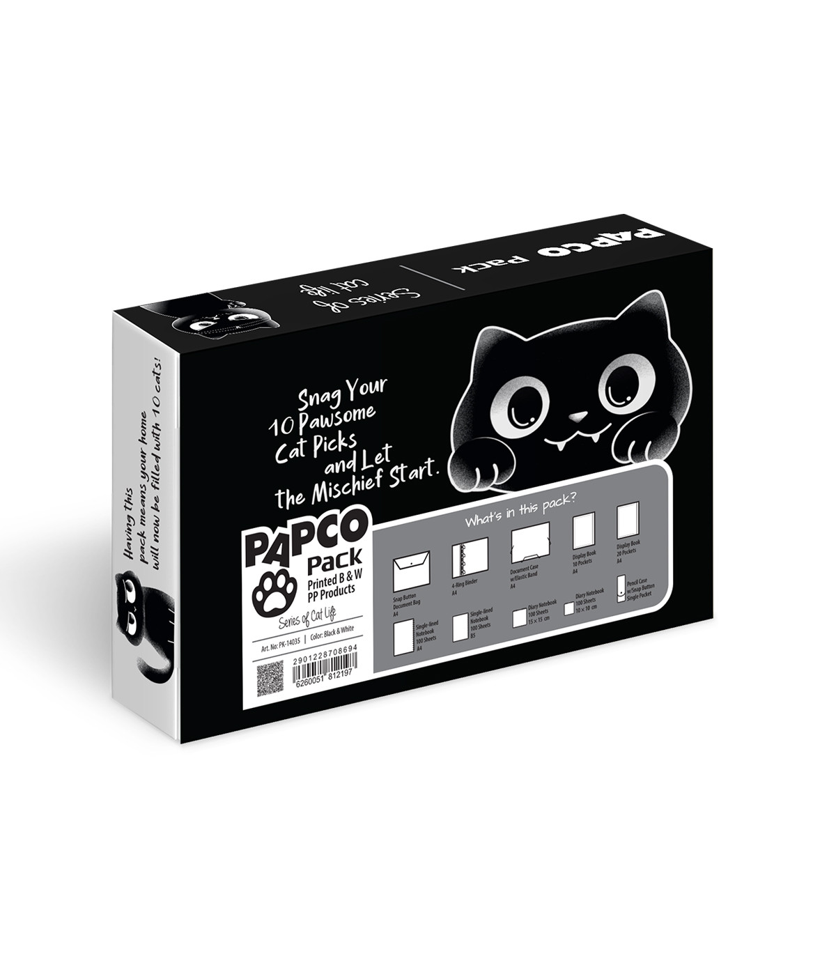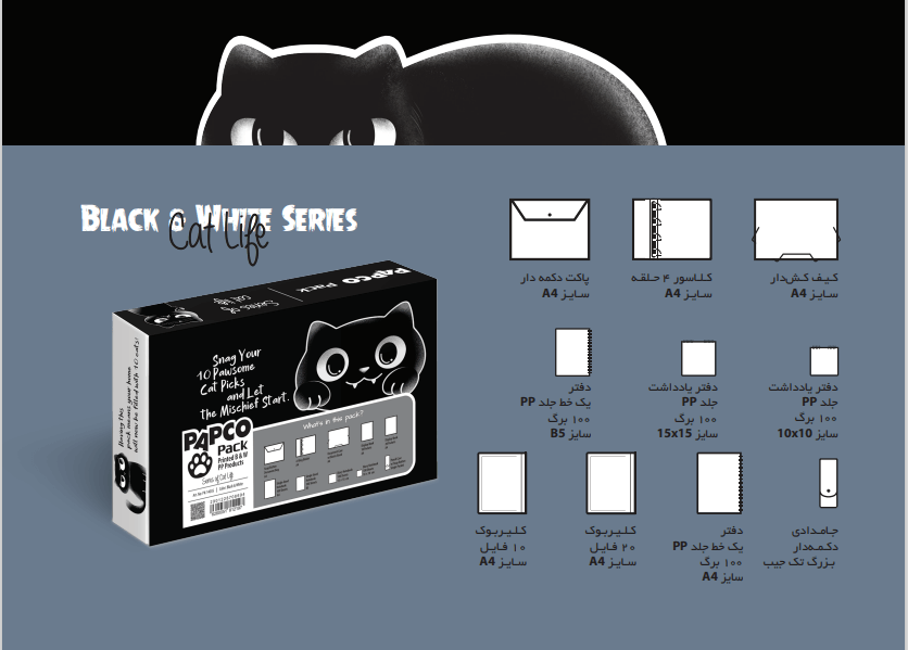 داخل پک محصولات B&W، کلی لوازم مدرسه مثل جامدادی، چند تا دفتر  و دفترچه، پاکت دکمه‌دار و چند تا فایل دیگه وجود دارد. لوازم تحریرهایی که در رنگ سفید و مشکی که روی آن‌ها تصاویری از گربه و طرح CAT LIFE  وجود دارد. محصولات بلک اند وایت یکی از محبوب‌ترین و جدید ترین  گروه محصولات پاپکو است.