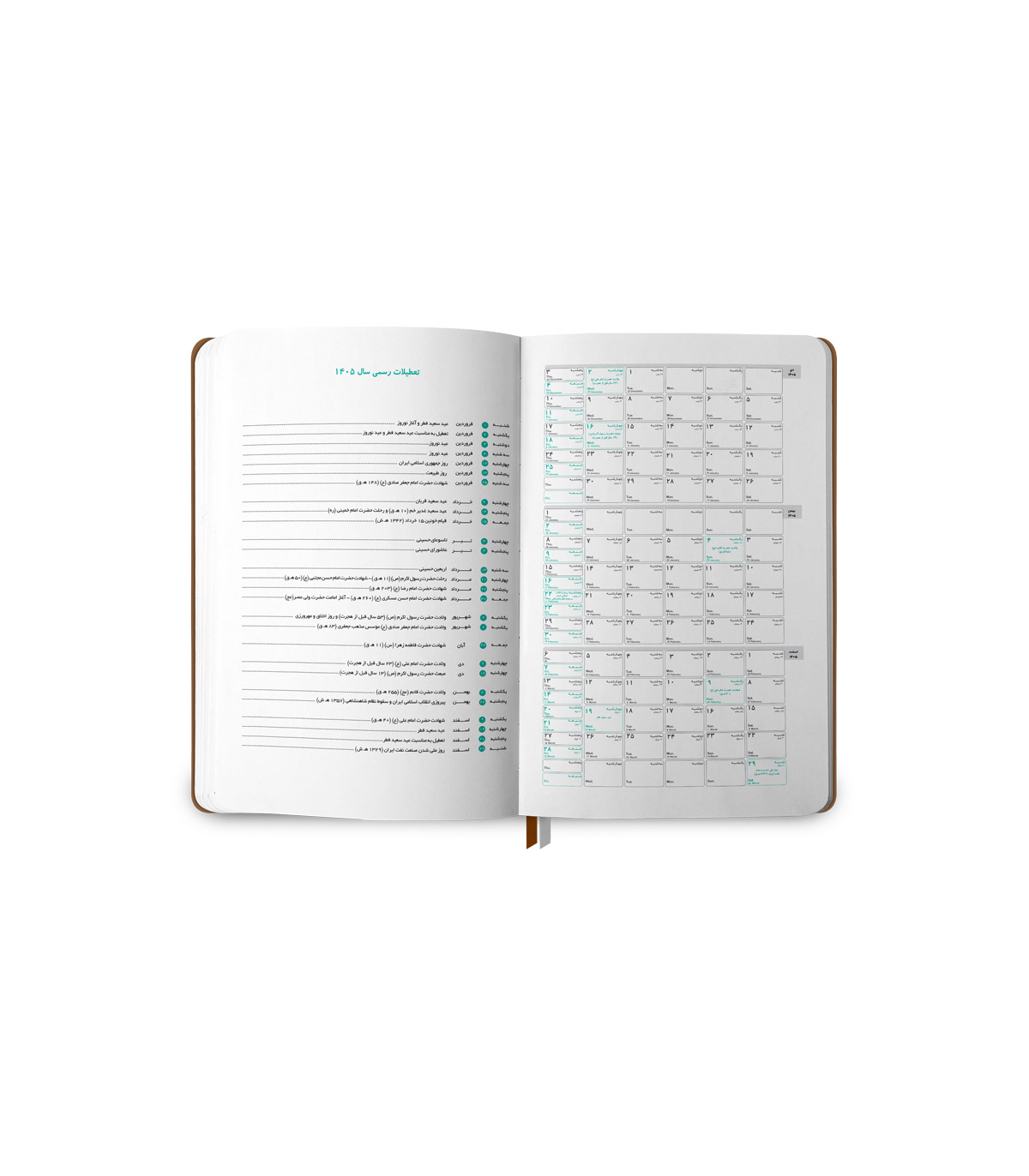 تمامی روزهای سال 1405 را می‌توانید در یک نگاه ببینید و با چند کلمه برنامه خود را جهت یادآوری در آن یادداشت کنید.