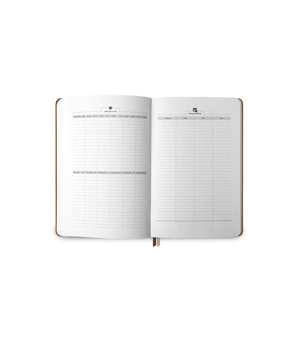 هزینه صفحه‌ای برای یادداشت‌ تاریخ، میزان درآمد و مبلغ هزینه‌ها و پس انداز هر ماه در نظر گرفته شده‌است.