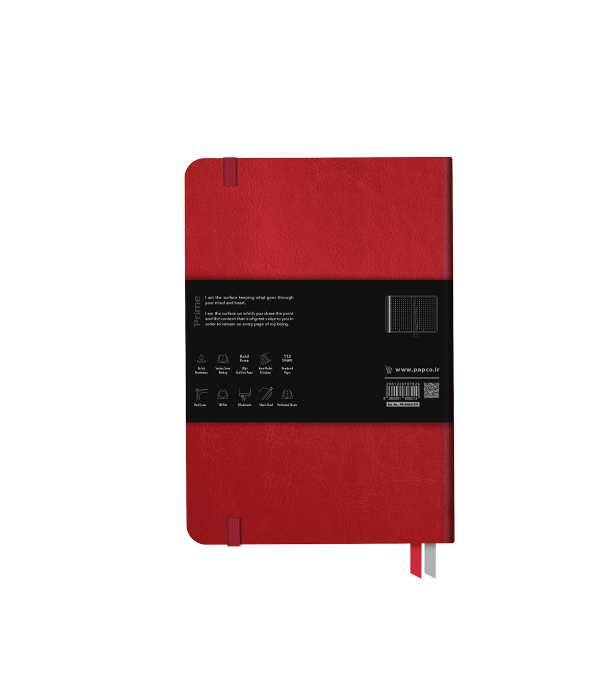 علاوه بر اینکه 112 برگ است، در صفحه اول آن می توانید نام و اطلاعات تماس خود را برای جلوگیری از گم شدن دفتر بنویسید. در انتهای این دفتر یک جیب کاغذی نگهدارنده برای قرار دادن برگه های شما تعبیه شده است که حاوی یک برگ برچسب می باشد. جنس جلد این دفتر مقوایی و به قدری سخت و محکم است که به هیچ عنوان پاره نمی شود و تا چندین سال می توانید از آن استفاده کنید. و پس از بسته شدن با یک کش محفوظ می شود. همچنین دارای 2 ربان نشانک جهت نشان کردن صفحات مورد نظر شما است.