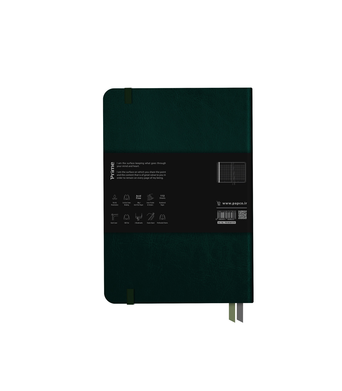 علاوه بر اینکه 112 برگ است، در صفحه اول آن می توانید نام و اطلاعات تماس خود را برای جلوگیری از گم شدن دفتر بنویسید. در انتهای این دفتر یک جیب کاغذی نگهدارنده برای قرار دادن برگه های شما تعبیه شده است که حاوی یک برگ برچسب می باشد. جنس جلد این دفتر مقوایی و به قدری سخت و محکم است که به هیچ عنوان پاره نمی شود و تا چندین سال می توانید از آن استفاده کنید. و پس از بسته شدن با یک کش محفوظ می شود. همچنین دارای 2 ربان نشانک جهت نشان کردن صفحات مورد نظر شما است.